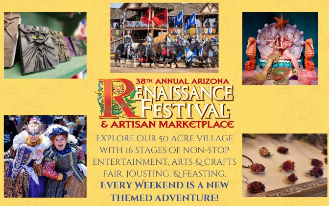 The AZ Renaissance Festival transports visitors to a medieval amusement park, a 16-stage theater, a 50-acre circus, an arts and crafts extravaganza, a jousting tournament, people powered games and rides, mermaids and a feast -- all rolled into one non-stop, ALL-DAY adventure.